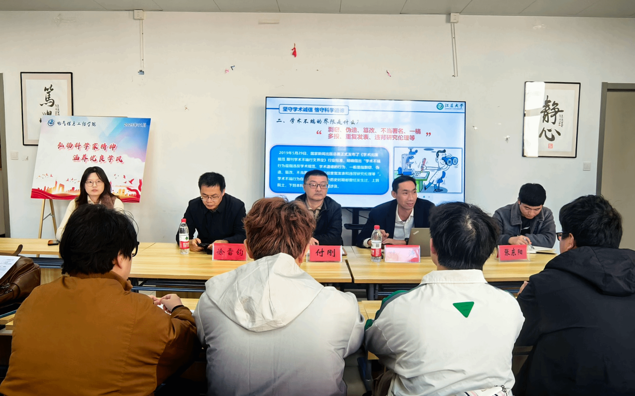 为全面贯彻党的二十届四中全会精神,紧扣习近平总书记关于科技创新与学风建设的重要指示要求,弘扬科学家精神,涵养优良学风,持续推进研究生科学道德与学风建设教育走深走实。11月21日,江苏大学电气学院联合钟灵书院依托共建育人平台,在钟灵书院会议室举办“科学道德与学风建设”宣讲活动。钟灵书院党总支书记付刚、电气学院党委副书记叶涛、副院长徐雷钧出席,钟灵书院辅导员张东阳及电气学院研究生参加。活动由电气学院辅导员罗缘圆主持。